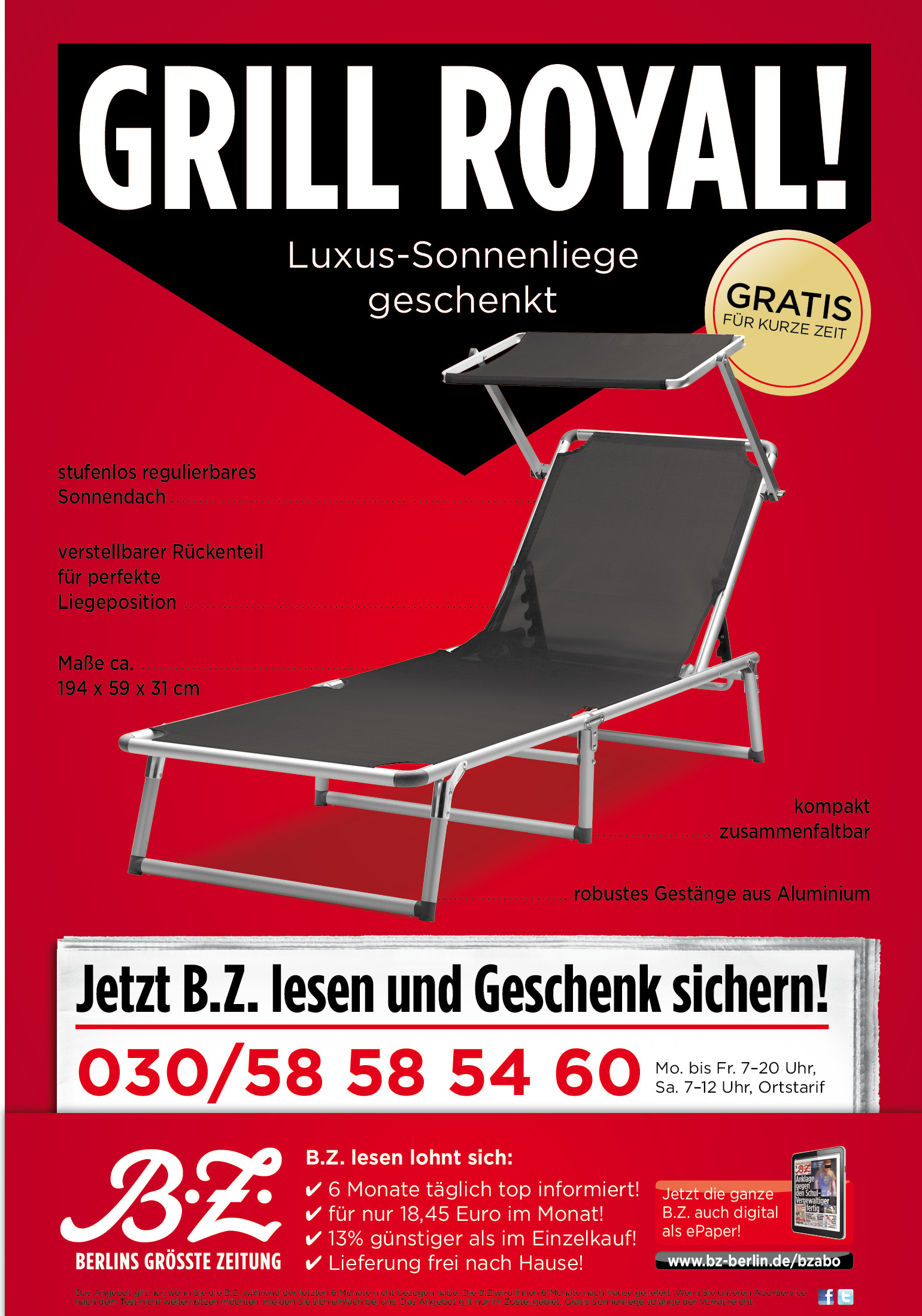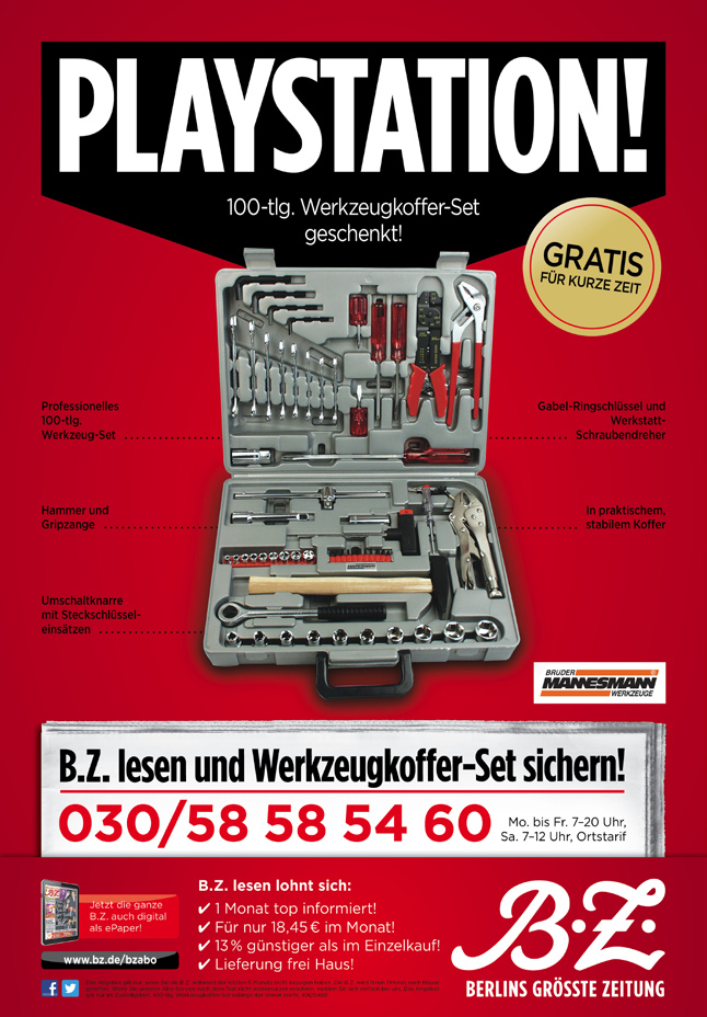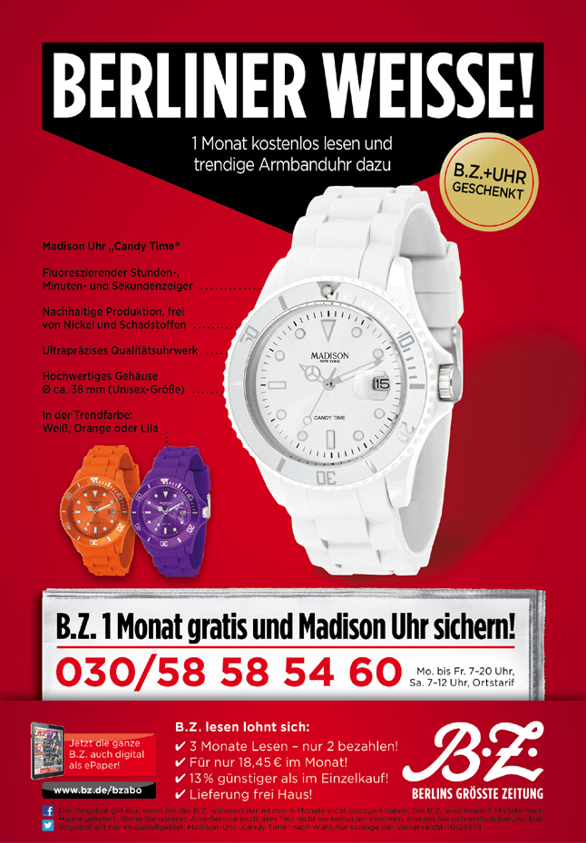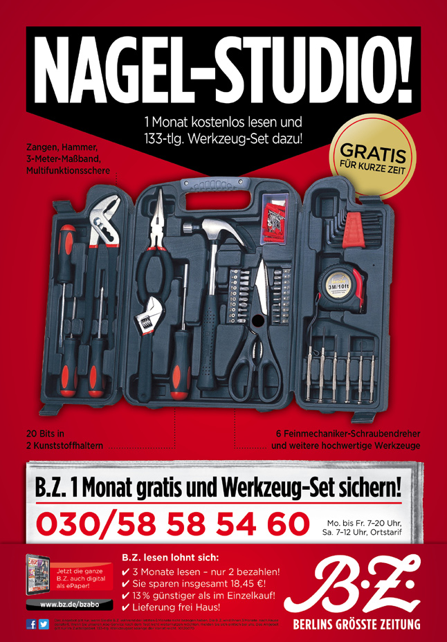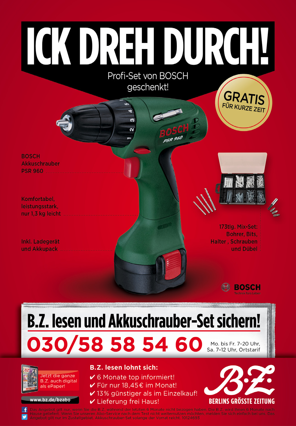 Berliner Zeitung mit Schuss Berlins größte Zeitung ist beliebt und bekannt für ihre volksnahe Ausrichtung. Für die Abo-Anzeigen bedeutet das: Klotzen statt Kleckern – also freche Headlines, ein Schuss Berlin und knackige Layouts. Ich habe die Anzeigen während meiner Tätigkeit für die Agentur DNS getextet.