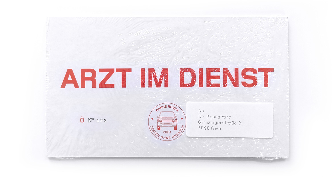 Arzt im Dienst-Tafel An die Zielgruppe wurden täuschend echt aussehende „Arzt im Dienst“-Tafeln verschickt. Diese legen Ärzte normalerweise ins Auto, um bei Rettungseinsätzen problemlos parken zu können. Unser Angebot: Einfach Schild ins Auto legen und in der Zwischenzeit entspannt den neuen Range Rover testen. Konzept und Text für die Agentur: Wunderman Vienna.