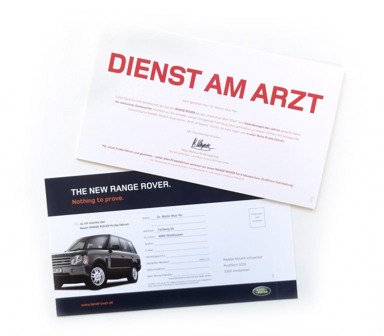 Direct-Mailing an Ärzte Land Rover Österreich verfügte über 300 Adressen von Ärzten, die den neuen Range Rover zum Auto des Jahres gewählt haben. Aber wie gewinnt man diese anspruchsvolle Zielgruppe am besten für eine Probefahrt im neuen Range Rover?