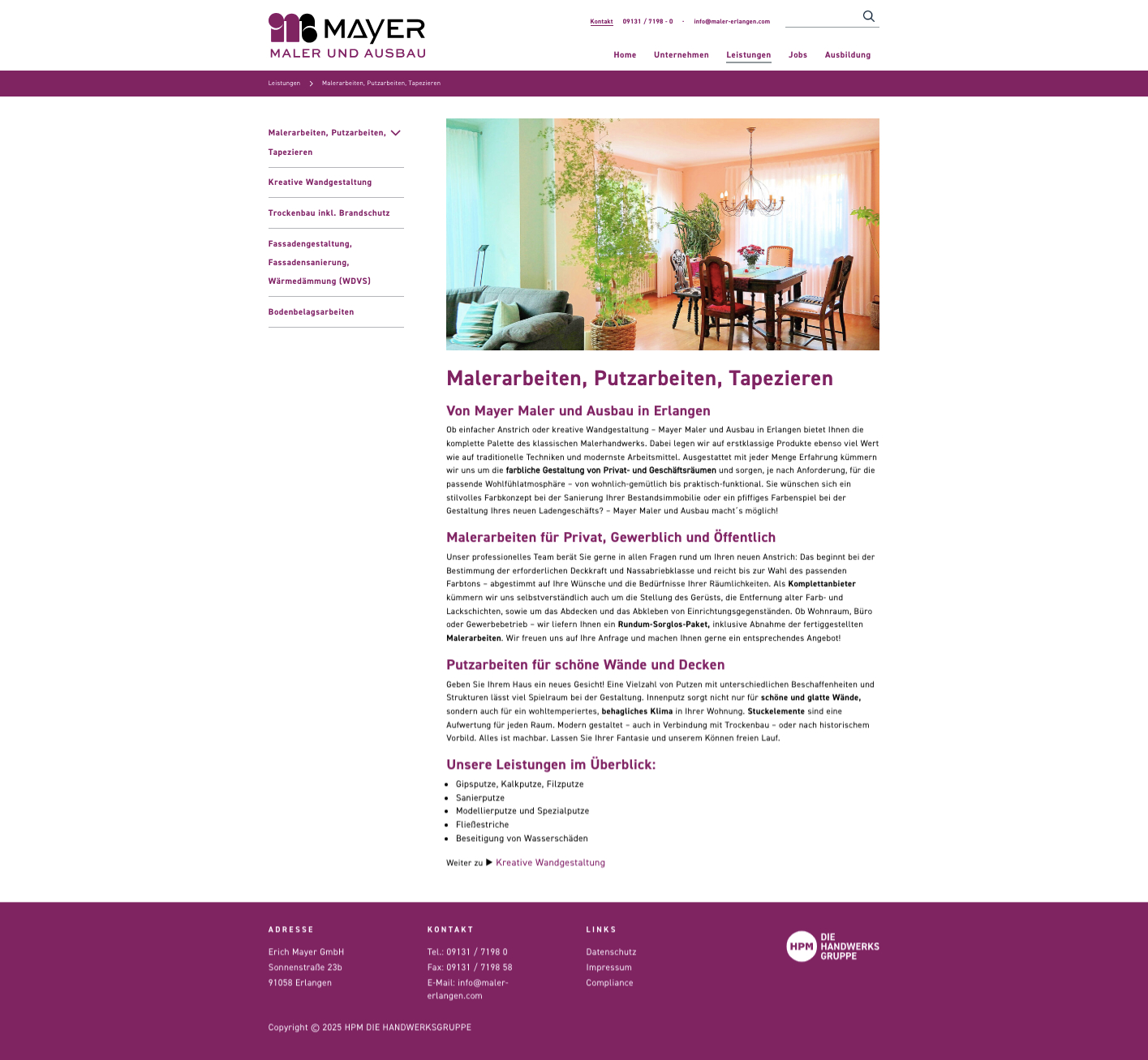 Top-Platzierungen mit SEO Seit mehr als 75 Jahren steht Mayer Maler und Ausbau für hochwertige Maler-, Putz-, Trockenbau- und Fassadenarbeiten in der Region Erlangen. Im Rahmen eines Relaunches wurde die Website umfassend überarbeitet und eine erstmalige Suchmaschinenoptimierung durchgeführt.