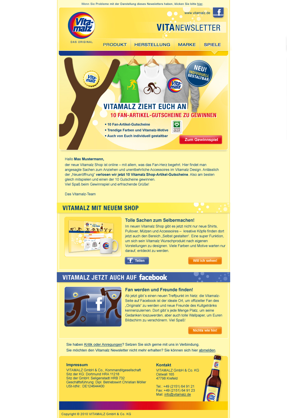 Community-Building Fixer Bestandteil der Markenkommunikation sind die braunen, den Piktogrammen der Olympiade 1972 nachempfundenen Figuren und die Grundfarbe Gelb. Die Welt um sie herum: jung, sympathisch, fröhlich, aktivierend, erfrischend. Um die Vitamalz-Fans an die Marke zu binden, wurden Newsletter, Gewinnspiele, ein Shop und eine Facebook-Seite entwickelt. Ich habe das Projekt bei der Agentur Pepperzak mitkonzipiert und getextet.