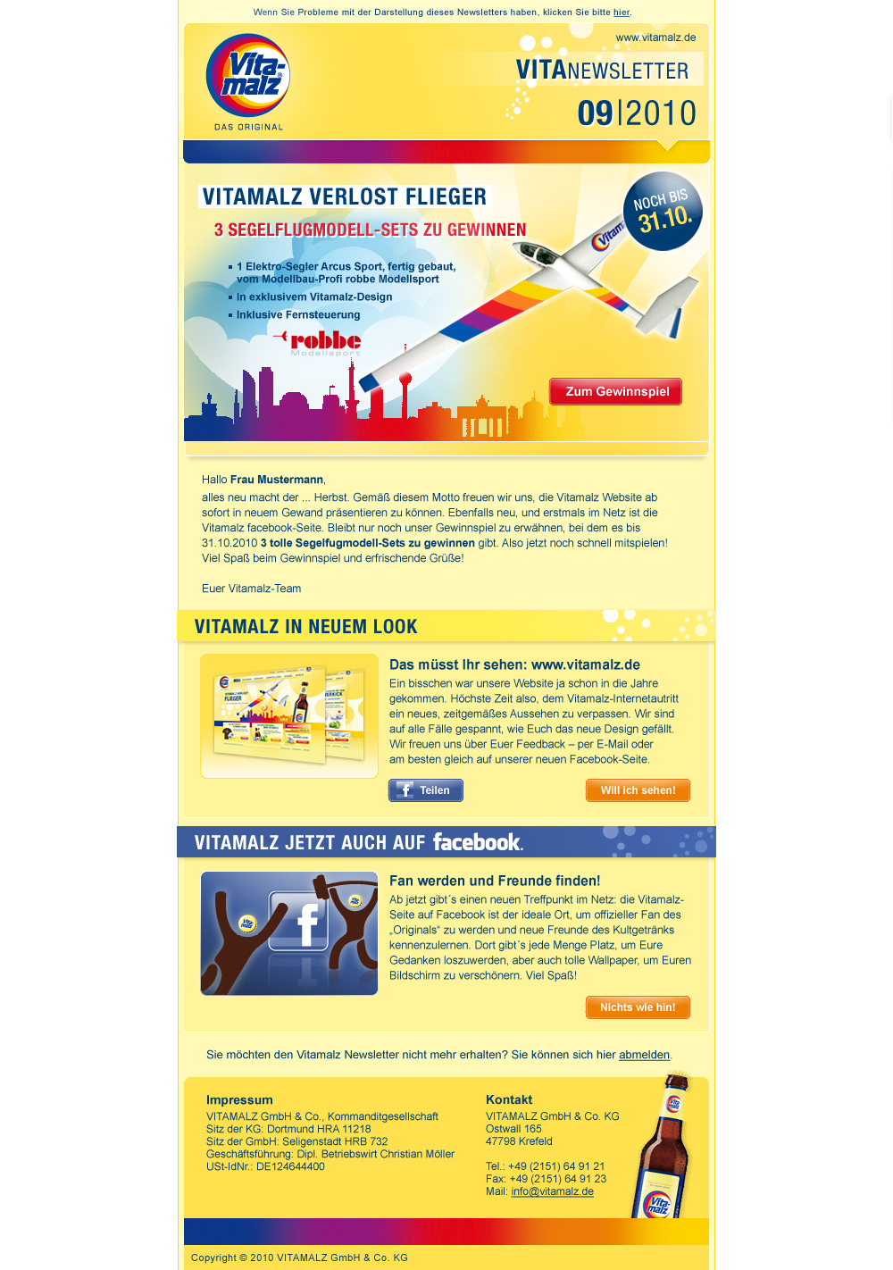 Community-Building Fixer Bestandteil der Markenkommunikation sind die braunen, den Piktogrammen der Olympiade 1972 nachempfundenen Figuren und die Grundfarbe Gelb. Die Welt um sie herum: jung, sympathisch, fröhlich, aktivierend, erfrischend. Um die Vitamalz-Fans an die Marke zu binden, wurden Newsletter, Gewinnspiele, ein Shop und eine Facebook-Seite entwickelt. Ich habe das Projekt bei der Agentur Pepperzak mitkonzipiert und getextet.